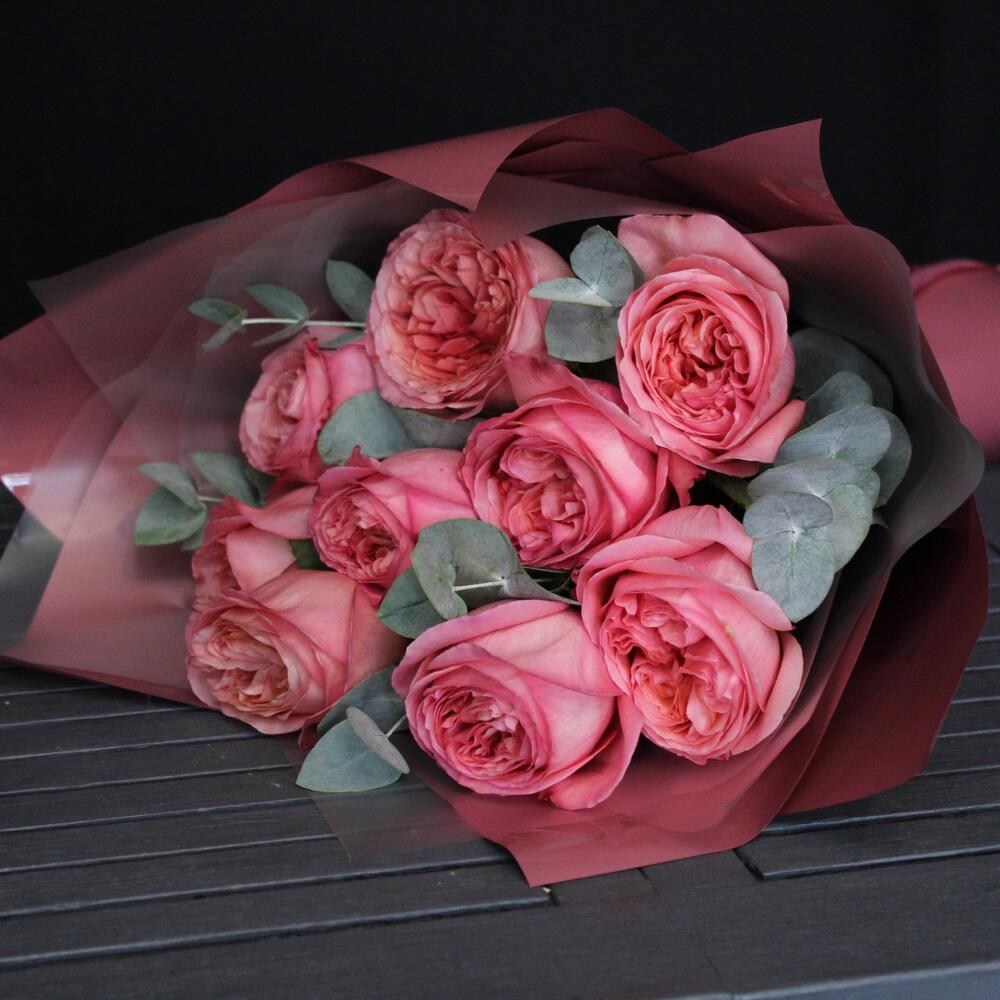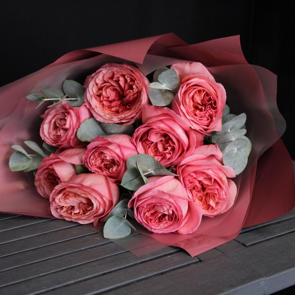 9 пионовидных роз pink x-pression с эвкалиптом