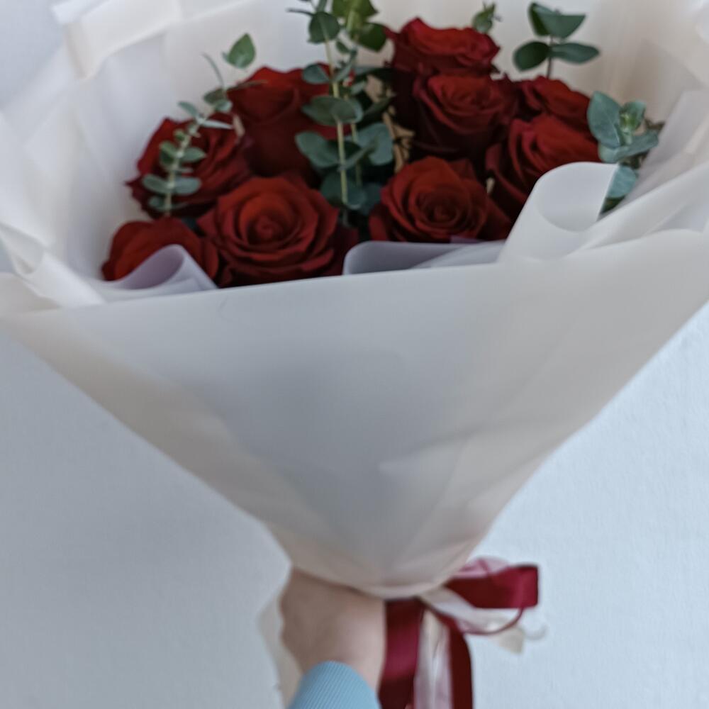 Самый страстный классический вариант бордовых роз с крупным бутоном и ароматным эвкалиптом. Такой букет расскажет о ваших чувствах , подойдет для любого повода (день рождения , юбилей, просто выражение симпатии)