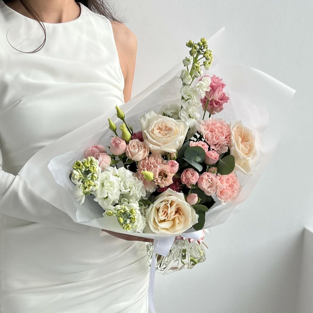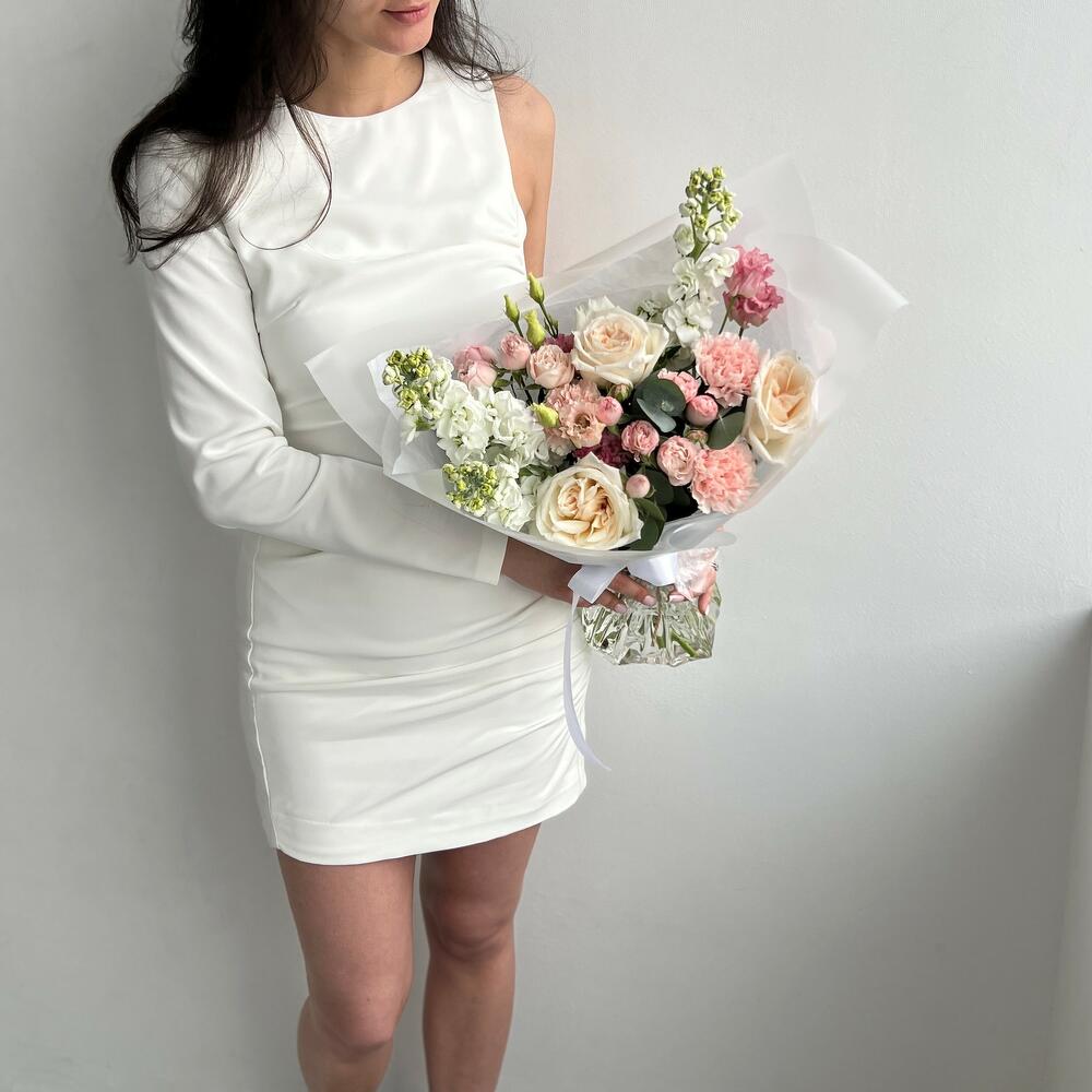 Маттиола – 3 шт.Эвкалипт – 3 шт.Кустовая роза – 2 шт.Гвоздика – 3 шт.Эустома – 1 шт.Садовая роза – 3 шт.