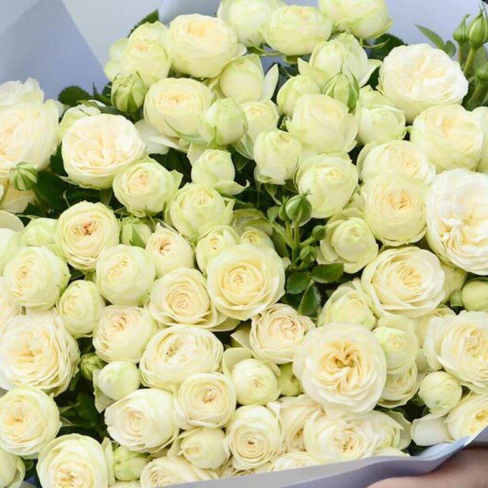 белые пионовидные розы – 21 шт. Упаковка дизайнерская – 3 шт. Лента атласная – 1 шт. Открыточка с вашими пожеланиями – 1 шт.