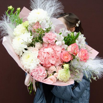 Белый авторский букет словно изящный танец света и чистоты. Изысканно переплетаясь, белые розы, каллы и лилии создают образ нежной элегантности, наполняя воздух сладким ароматом и сиянием свежести. Этот букет словно поэзия из белоснежных красок, в которой каждый цветок является чистым выражением вечной красоты.
