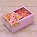 макарон (пирожное) – 12 шт. коробка – 1 шт. кустовая хризантема – 2 шт. кустовой диантус – 5 шт. кустовая роза – 2 шт. роза мисс пигги – 3 шт. лимониум – 2 шт. – 1 шт.