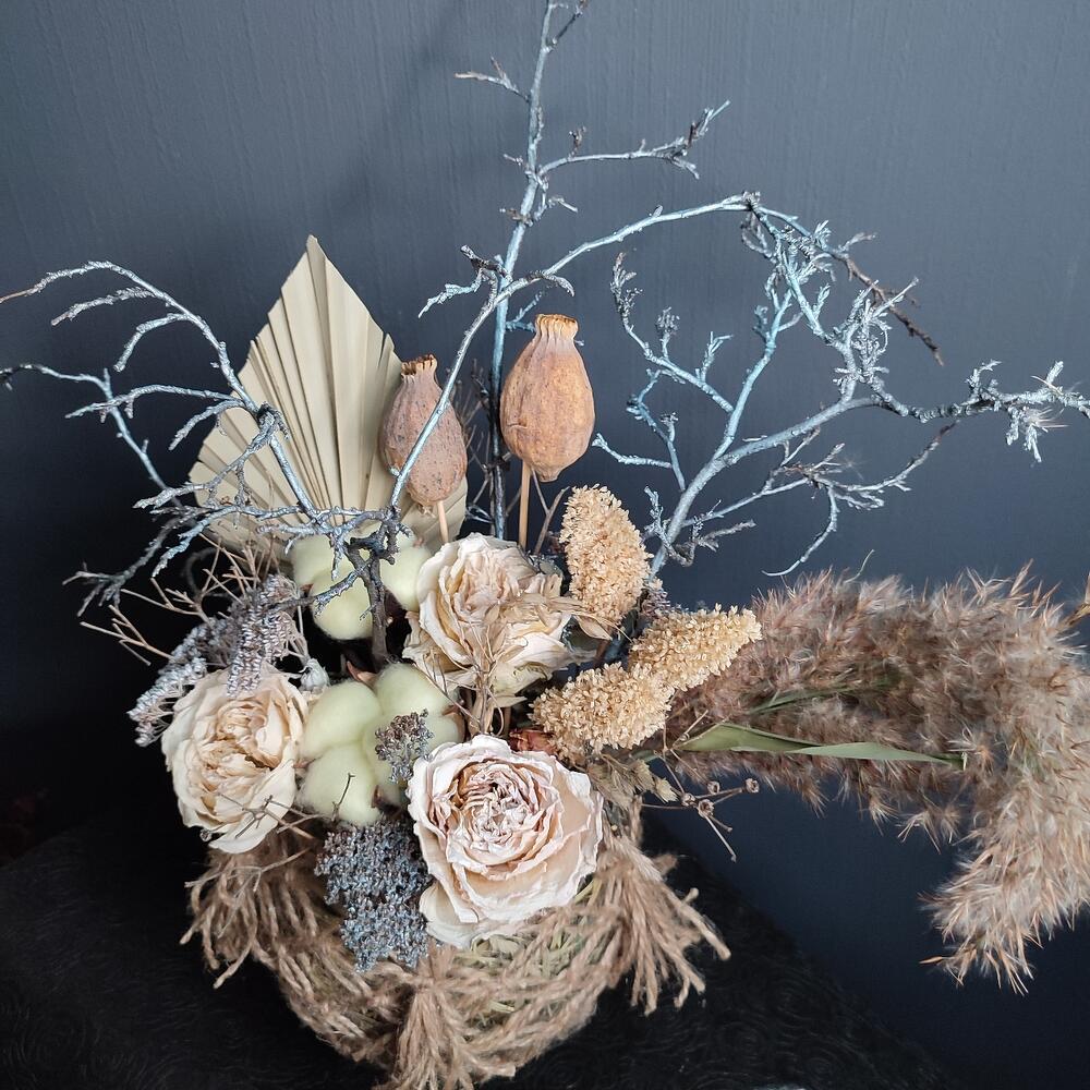 Сухоцветы – 7 шт.Ваза стекло – 1 шт.Джут – 150 шт.Оазис флористический – 2 шт.Хлопок натуральный – 2 шт.Лист пальмы – 1 шт.Эквадор роза – 3 шт.мак декоративный – 2 шт.ветки декоративные – 3 шт.