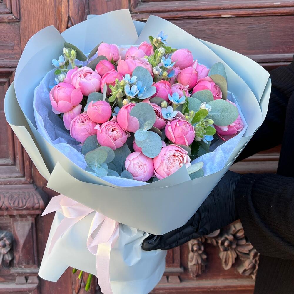Эвкалипт – 3 шт.Лента атласная – 2 шт.Тишью – 2 шт.Оксипеталум – 5 шт.Пленка матовая – 6 шт.роза кустовая пионовидная сильва пинк – 7 шт.