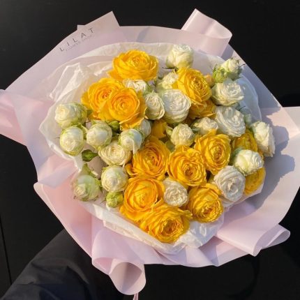 Букет из белых роз и белой алтстромерии в дизайнерской упаковке