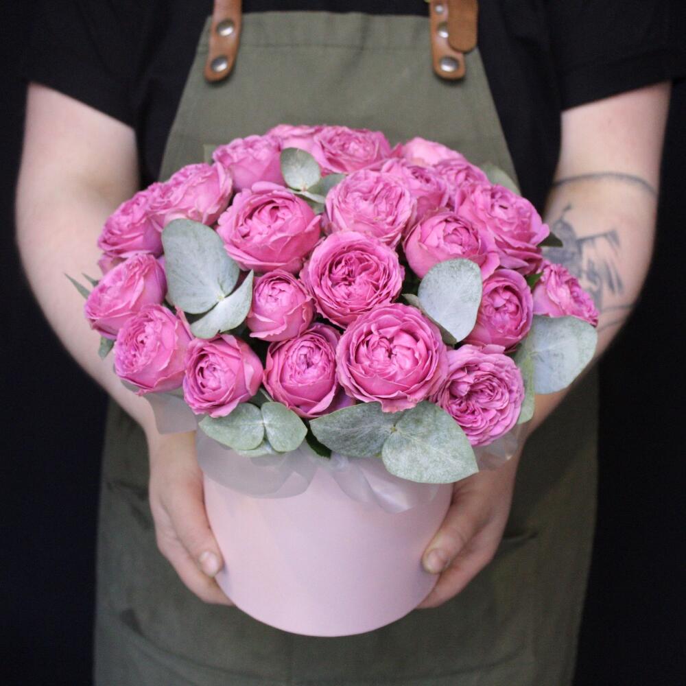 Эвкалипт – 3 шт.Шляпная коробка – 1 шт.Оазис флористический – 1 шт.Пленка дизайнерская – 2 шт.роза кустовая пионовидная misty bubbles – 11 шт.
