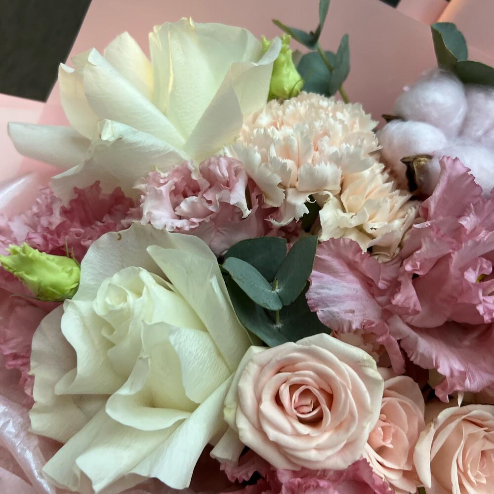 Хлопок – 3 шт.Диантус – 3 шт.Кустовая роза – 2 шт.Пионовидная роза – 1 шт.Одноголовая роза – 2 шт.Лизиантус – 2 шт.декоративная упаковка – 1 шт.Атласная лента – 1 шт.