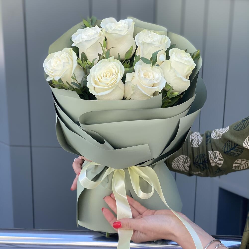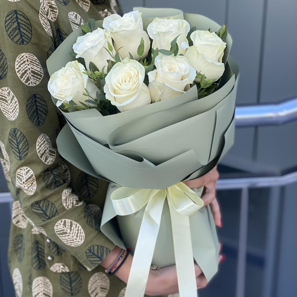 Эвкалипт – 2 шт. Роза белая – 7 шт. Оформление – 1 шт.