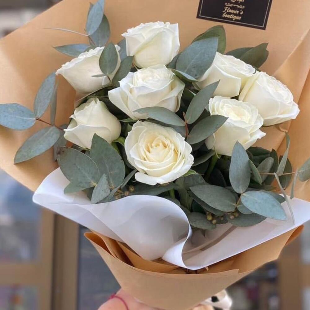 Шикарный букет из белых роз с эвкалиптом в шикарной упаковке