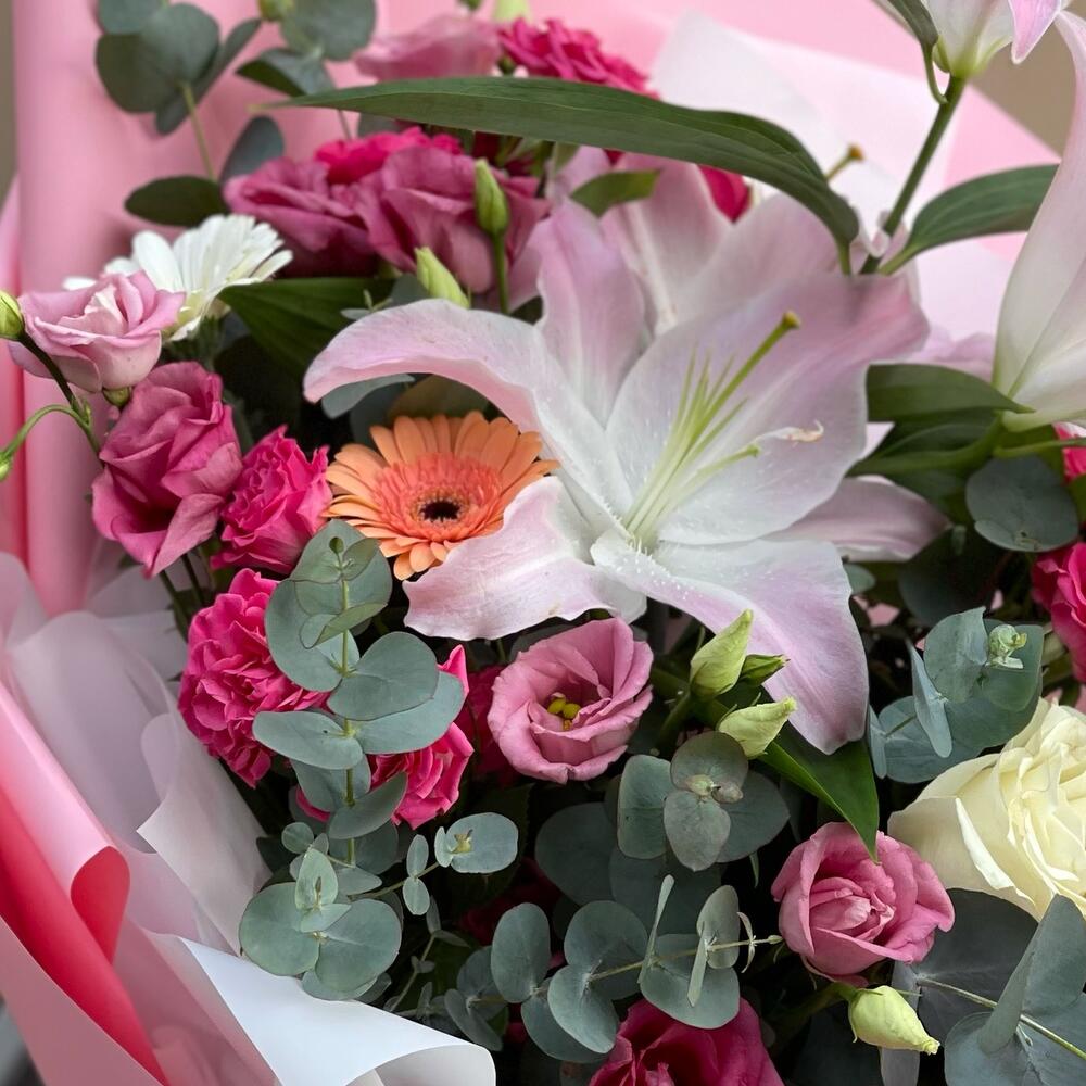 Лилия – 1 шт.Гербера мини – 3 шт.Лизиантус – 3 шт.Эвкалипт – 2 шт.Кустовая роза – 3 шт.Роза – 3 шт.бумага флористическая – 1 шт.Лента – 1 шт.