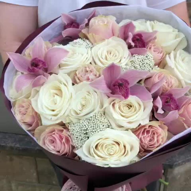 Озотамнус – 4 шт.Орхидея Цимбидиум – 5 шт.Писташ – 3 шт.Тишью – 2 шт.Пионовидная роза – 10 шт.Упаковка дизайнерская – 5 шт.Роза пинк мондиаль – 9 шт.лента премиум – 5 шт.