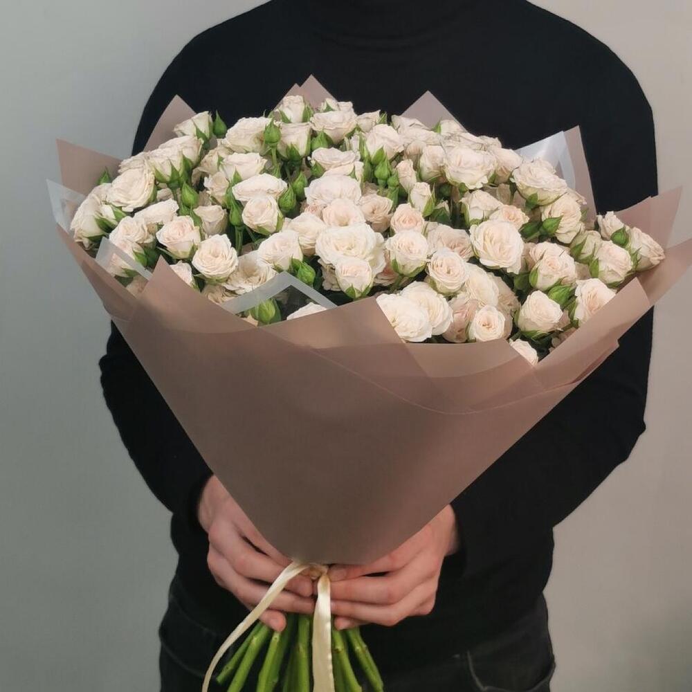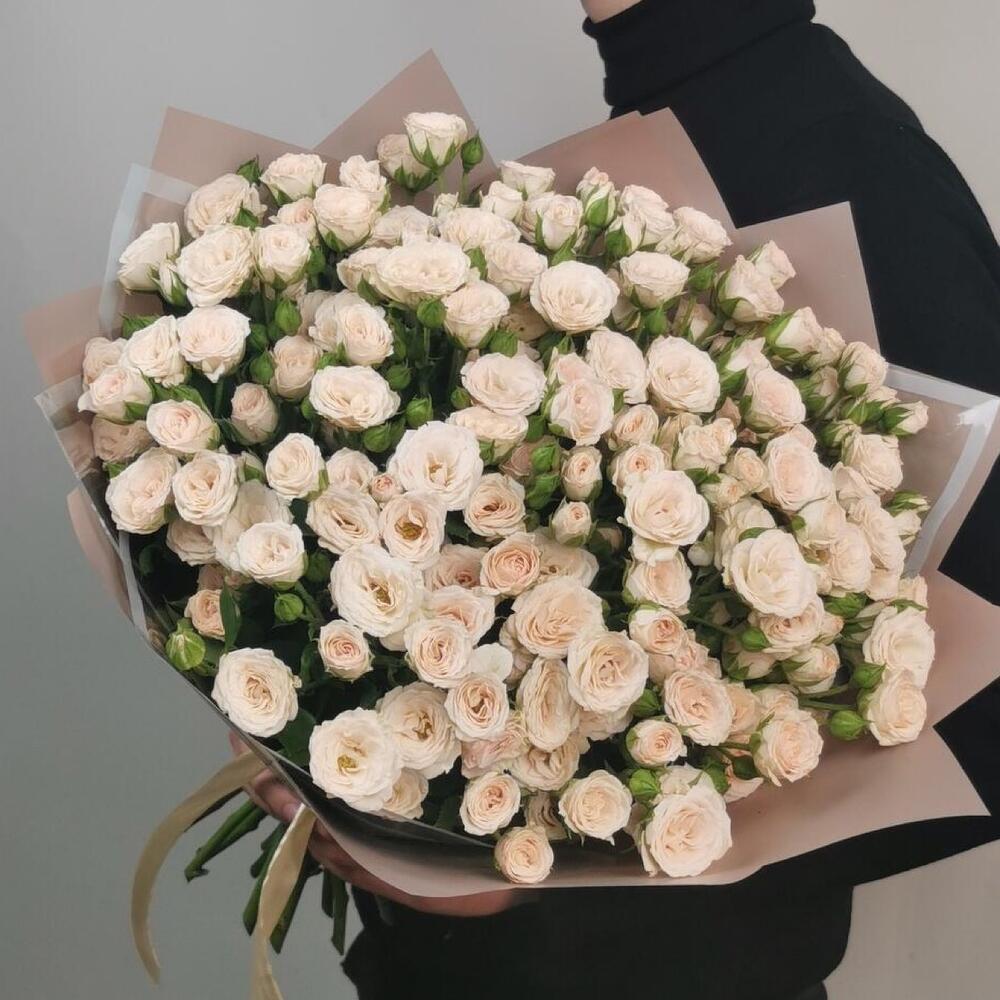 Кустовая роза пионовидная – 21 шт. Упаковка дизайнерская – 2 шт. Открыточка с вашими пожеланиями – 1 шт.