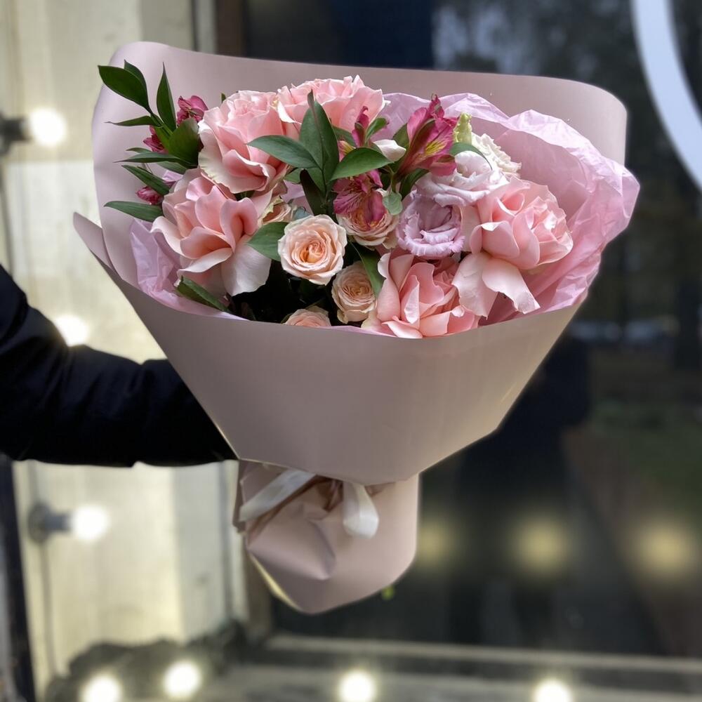 Альстромерия – 2 шт. Рускус – 2 шт. Кустовая роза – 1 шт. Эустома – 1 шт. Упаковка дизайнерская – 1 шт. французская роза пинк мондиаль – 5 шт.
