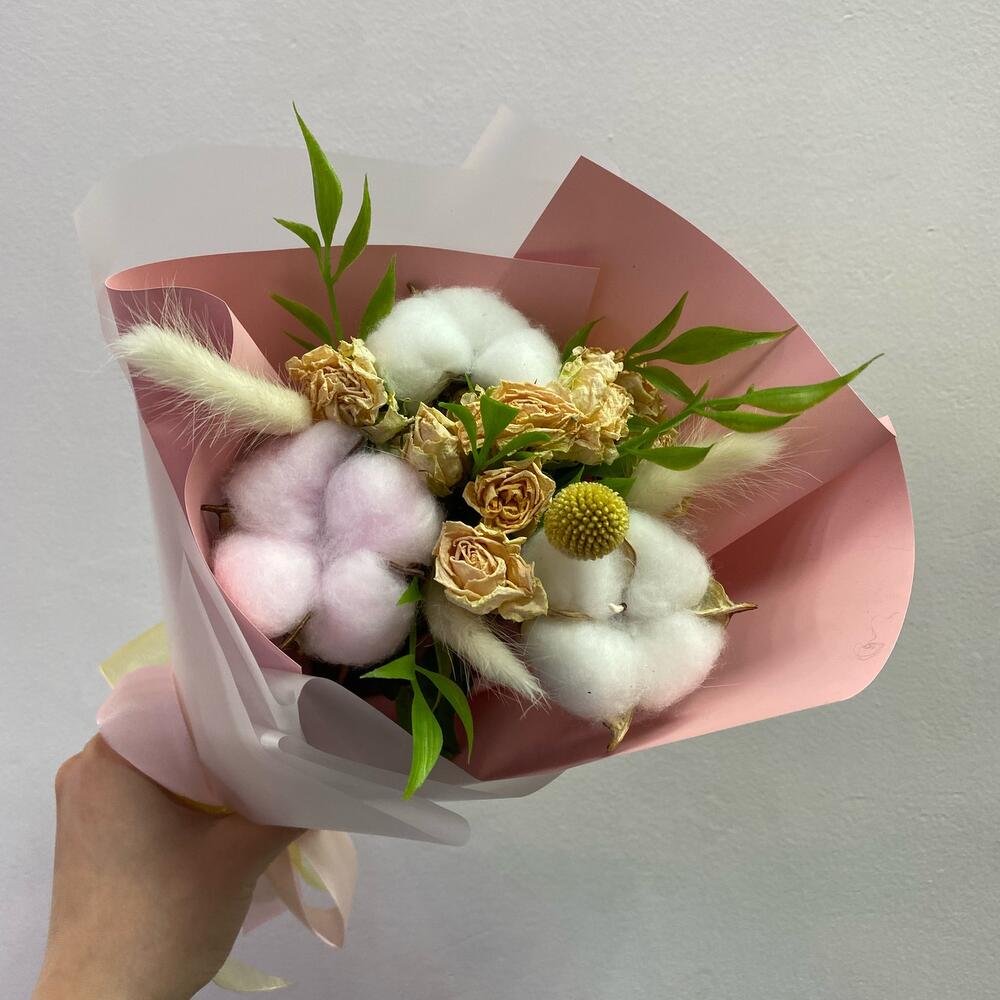 Хлопок – 3 шт.Роза кустовая – 1 шт.Лагурус – 3 шт.Авторская упаковка – 1 шт.Открыточка с вашими пожеланиями – 1 шт.