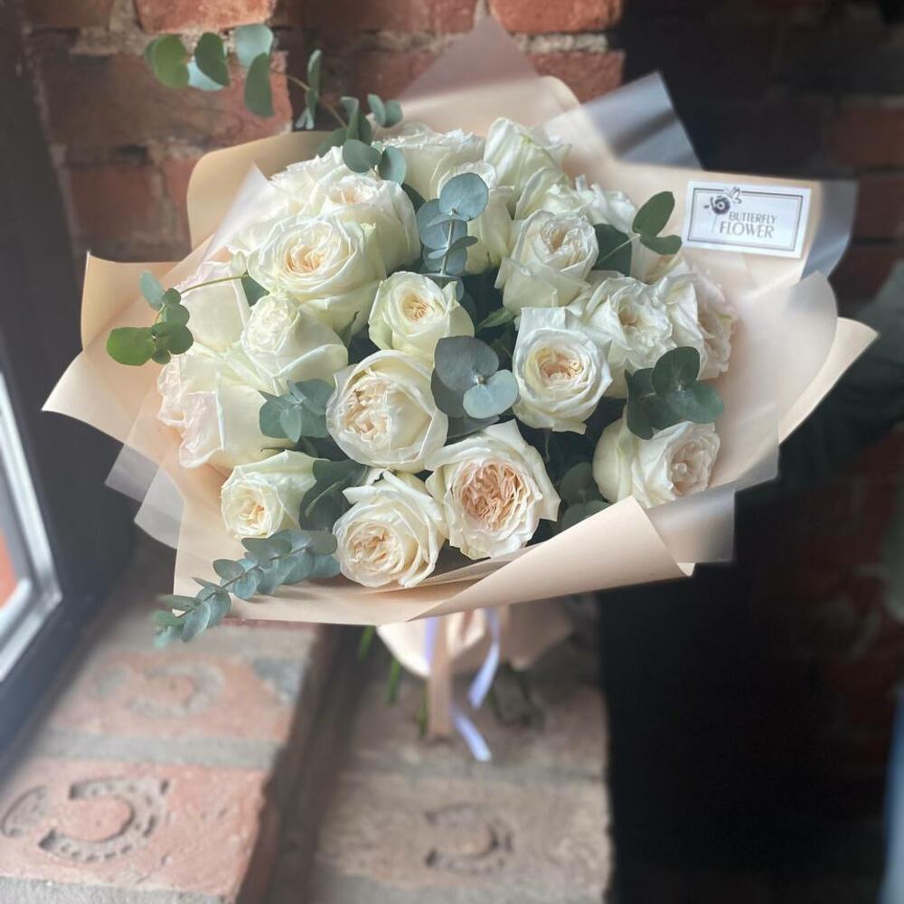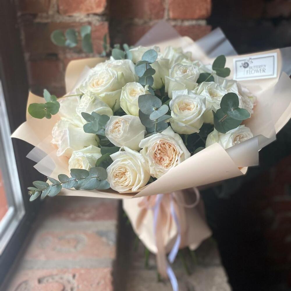 Букет из 25 пионовидных роз в стильной упаковке “Меренговое облако”