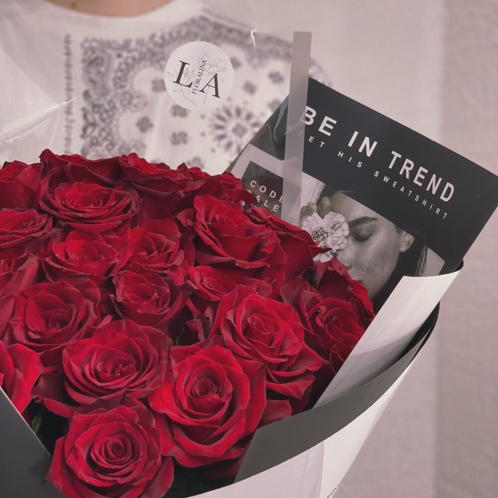 Роза Эквадор – 25 шт.Лента атласная – 2 шт.Упаковка дизайнерская – 5 шт.
