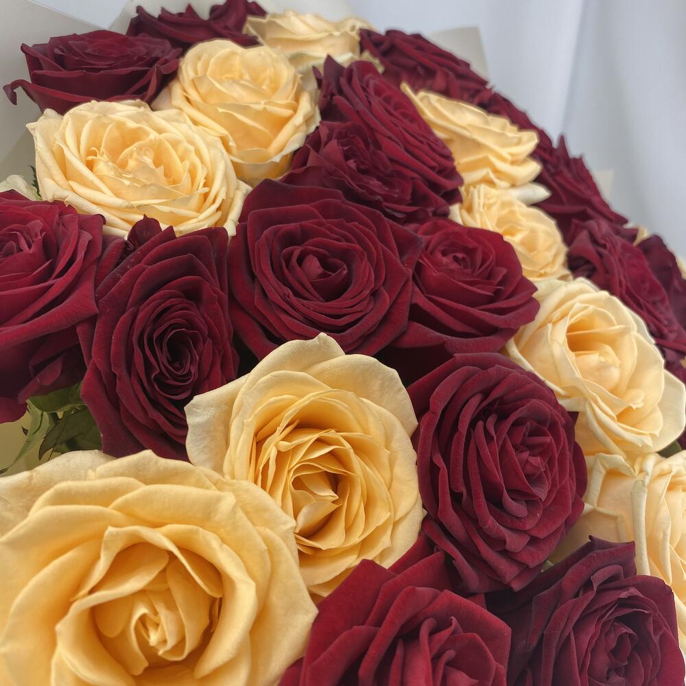 Букет из 35 красных и персиковых роз