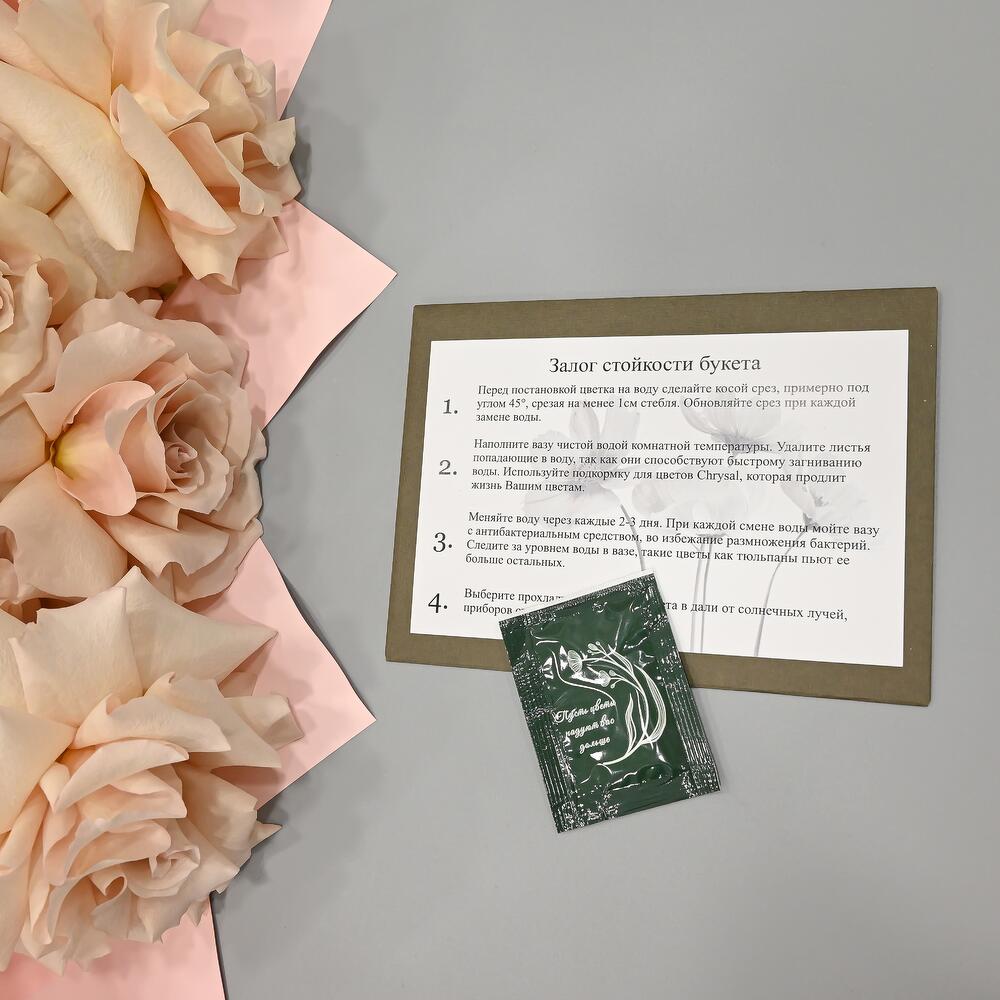 - Сроки возврата: Претензии по качеству букета принимаются в течение 24 часов с момента его получения.