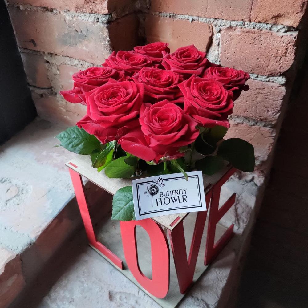 Букет из 9 роз в коробке с колбами “Love”