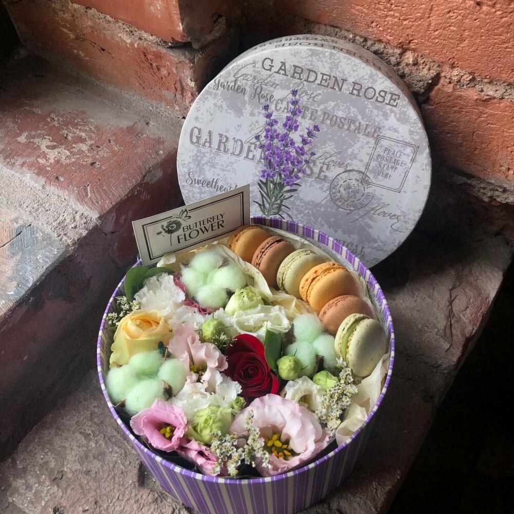 Роза кустовая – 4 шт.Хлопок – 3 шт.Эустома – 1 шт.Шляпная коробка – 1 шт.Макарон – 6 шт.декоративная зелень – 2 шт.