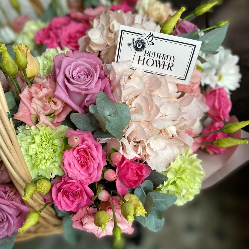 Букет из гортензии, гвоздик, гиперикума, эустомы, роз, эвкалипта и фисташки в плетеной корзине “Ариадна”
