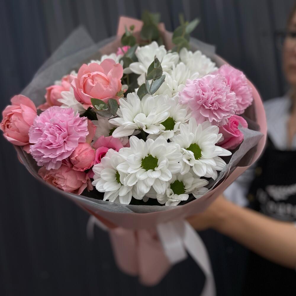 Категории: Гвоздики, Пионовидные розы, Розы, Хризантемы
