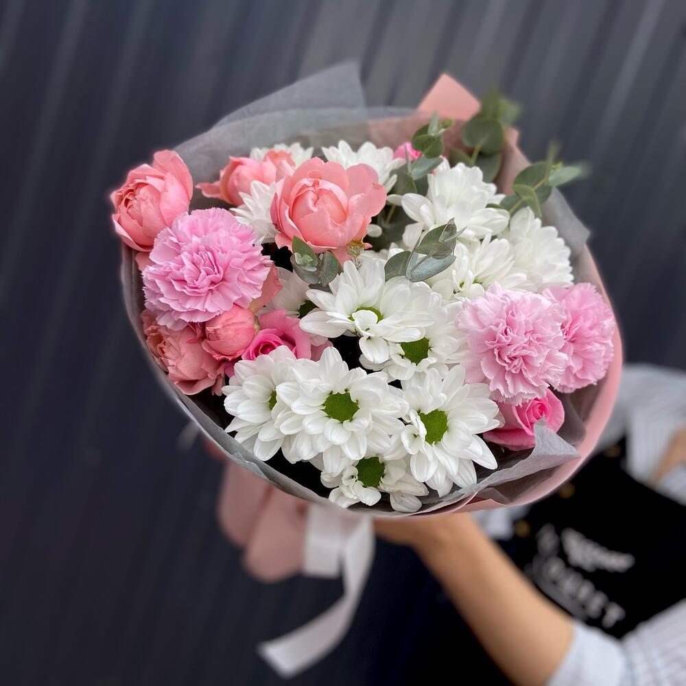 Нежный, легкий букет из стойких хризантем, диантуса и очаровательной пионовидной розы Джульетта