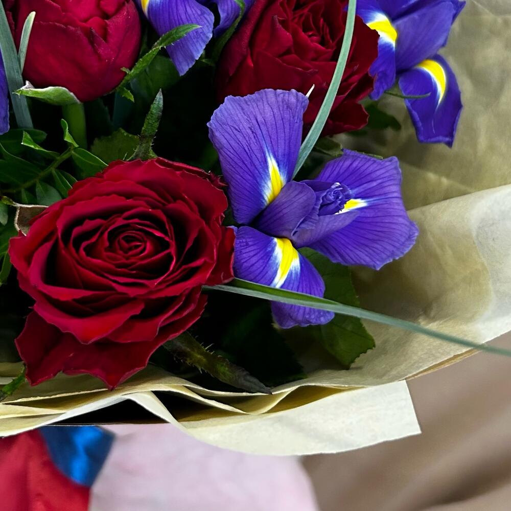 Роза – 7 шт.Ирис – 9 шт.Упаковка дизайнерская – 2 шт.Лента атласная – 2 шт.