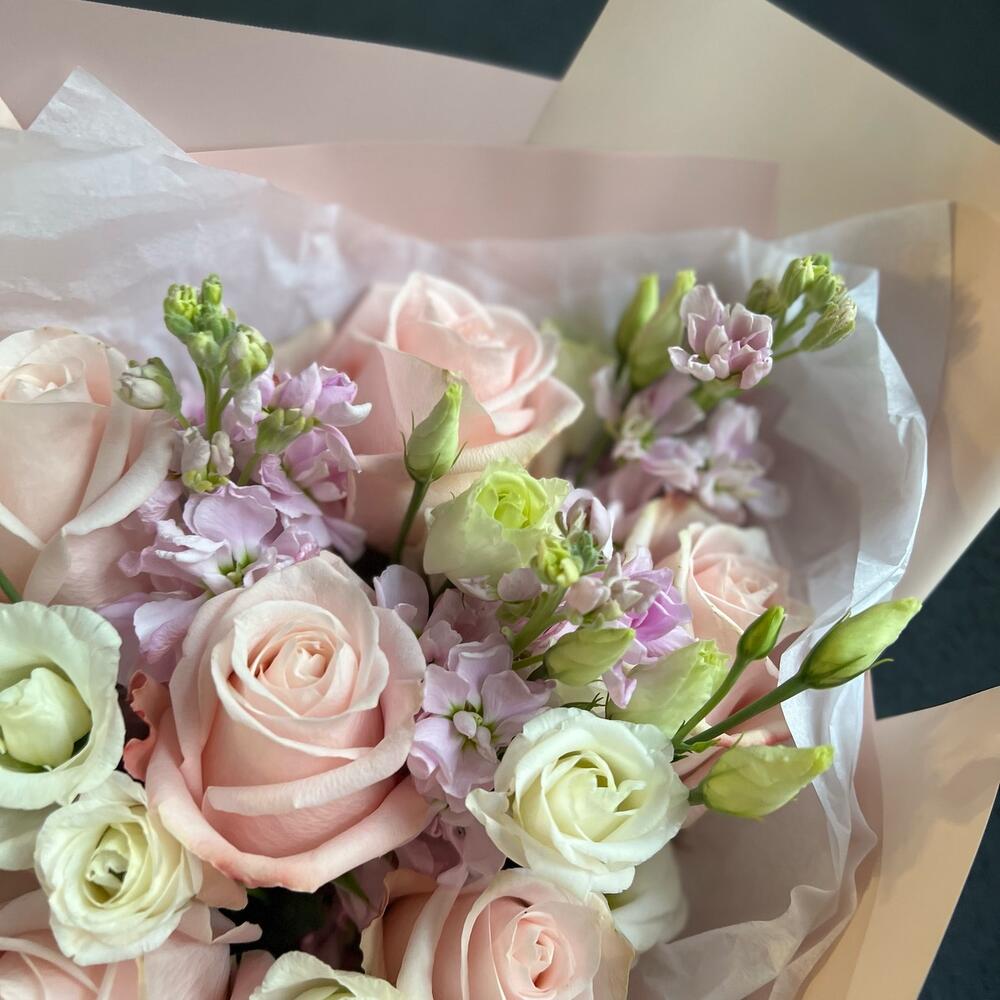 Маттиола – 3 шт.Эустома – 3 шт.Роза – 7 шт.декоративная упаковка – 1 шт.Атласная лента – 1 шт.