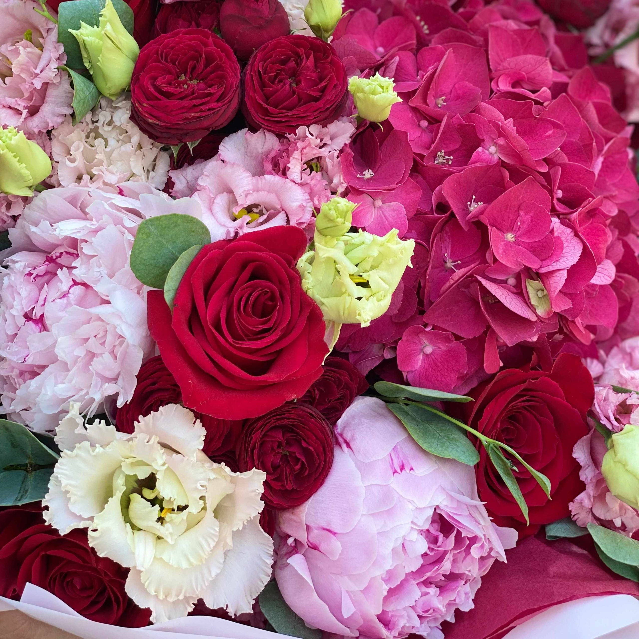 Яркий комплимент: яркие цветы в сумочке (лизиантус, красная роза, пионовидная кустовая роза