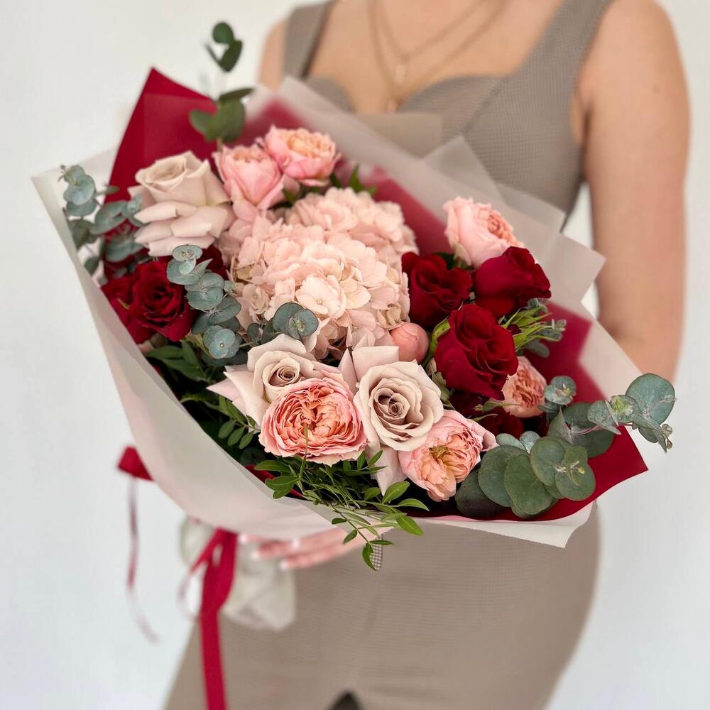 Гортензия – 1 шт.Роза кустовая – 2 шт.Эвкалипт – 3 шт.Роза – 3 шт.Фисташка – 3 шт.Упаковка дизайнерская – 3 шт.Пионовидная кустовая роза – 2 шт.