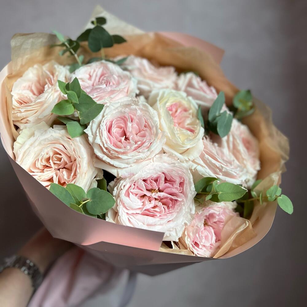 Эвкалипт – 5 шт.Атласная лента – 1 шт.декоративная упаковка – 1 шт.пионовидная роза тсумуги – 11 шт.