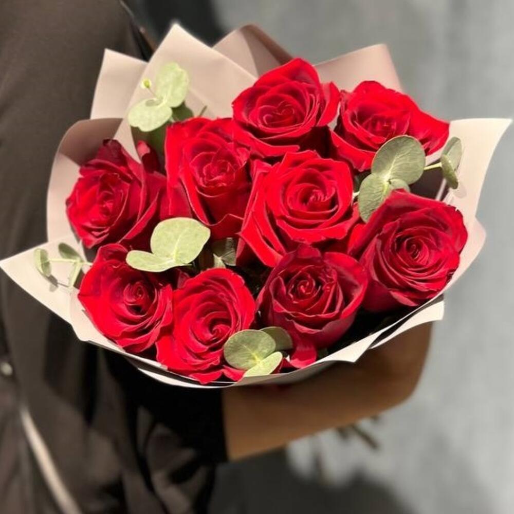 Эвкалипт – 3 шт.Лента атласная – 2 шт.Упаковка дизайнерская – 2 шт.бордовые эквадорских розы – 9 шт.