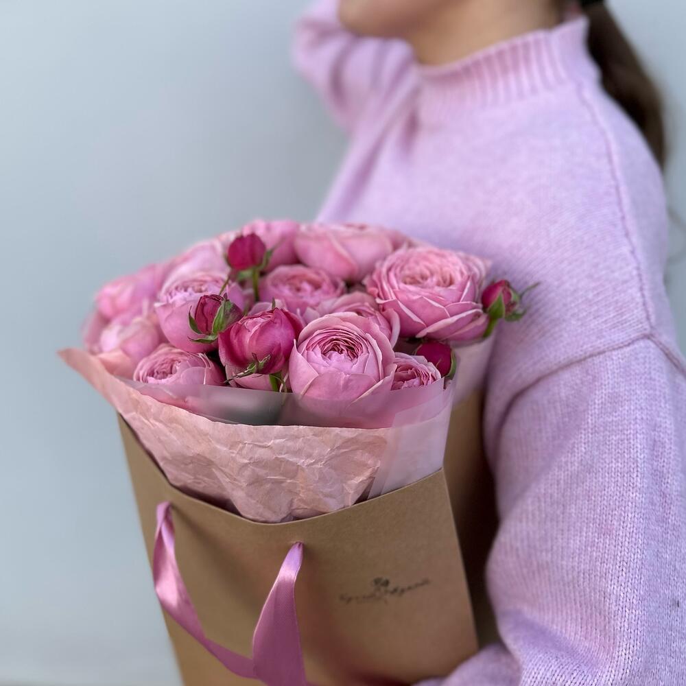 Лента атласная – 1 шт.Роза пионовидная кустовая – 5 шт.Пленка матовая – 1 шт.Крафт жатый – 1 шт.Пакет крафтовый – 1 шт.