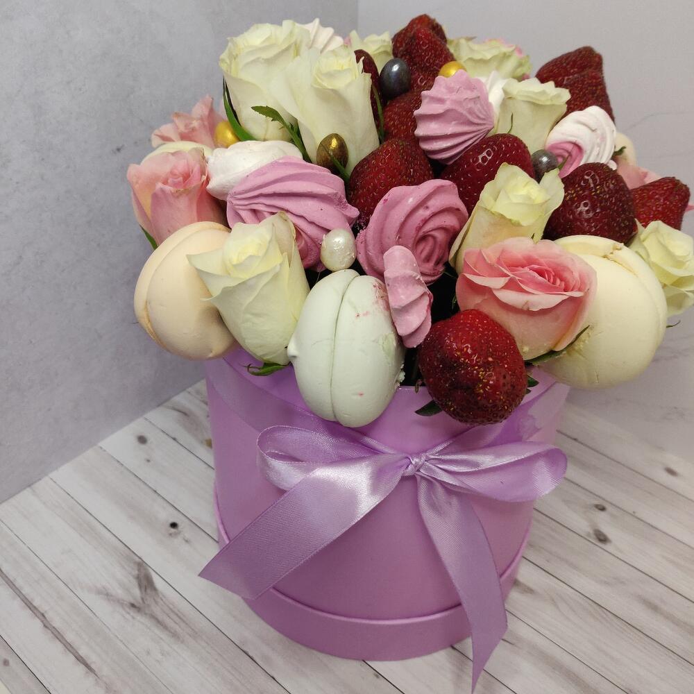 Роза белая – 9 шт.розы розовые – 8 шт.Клубника – 300 гр.зефир цветной – 300 гр.Меренга ручной работы – 50 гр.орешки в глазури – 50 гр.Шляпная коробка – 1 шт.
