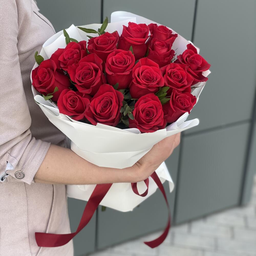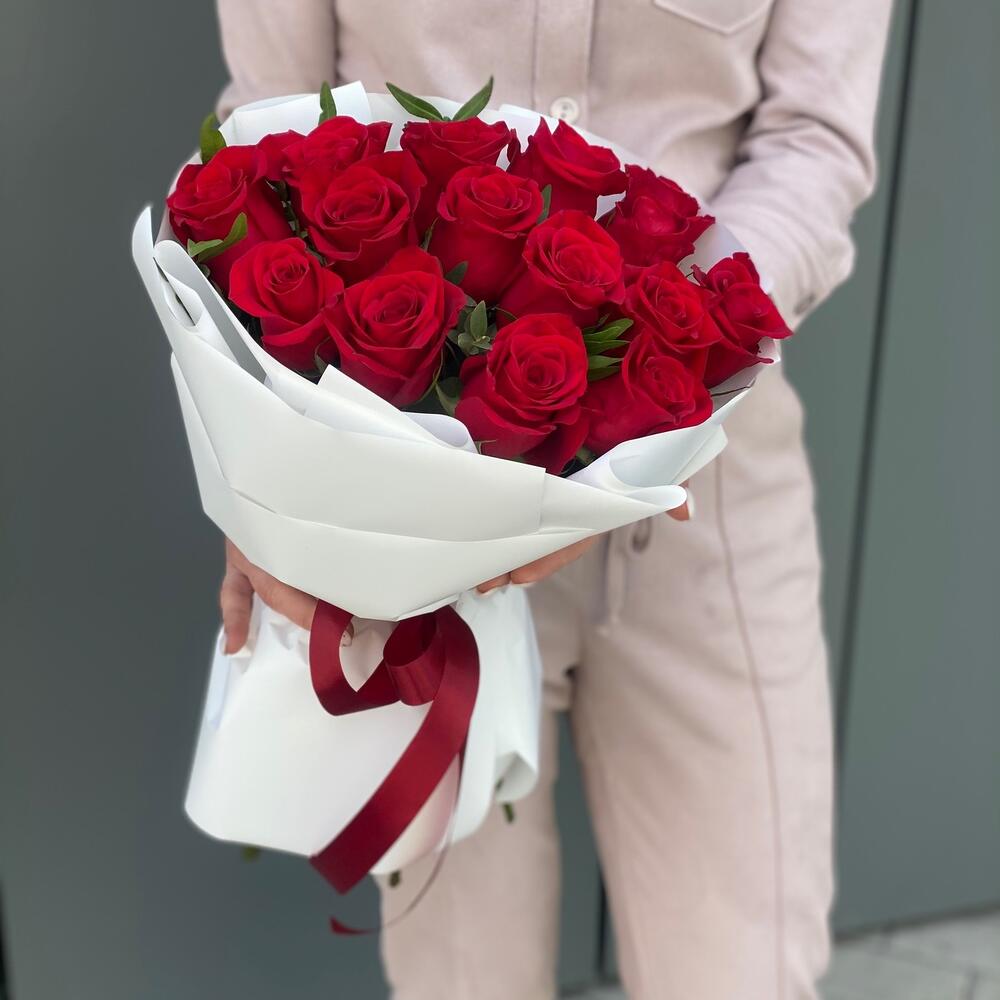 Роза Freedom – 15 шт. Оформление – 1 шт. Эвкалипт парфиволия – 2 шт.