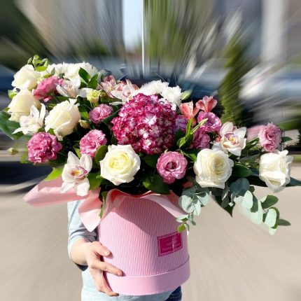 Альстромерии, Гортензии, Кустовые розы, Лизиантусы, Розы, Хризантемы