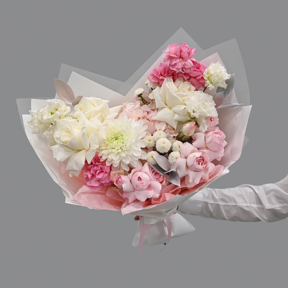 Французская роза – 3 шт.Пионовидная кустовая роза – 2 шт.Хризантема – 1 шт.Гортензия – 1 шт.Гвоздика – 4 шт.эустома белая – 2 шт.Рускус – 3 шт.Сантини – 2 шт.Упаковка дизайнерская – 2 шт.