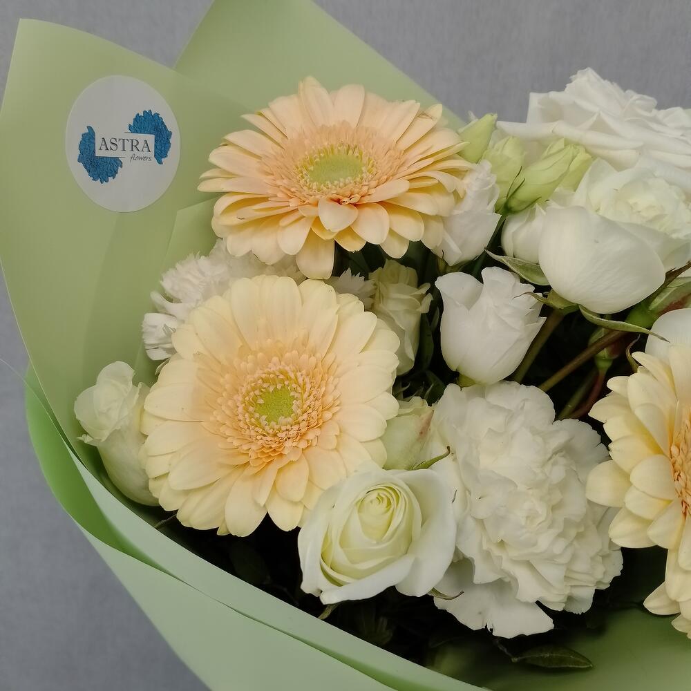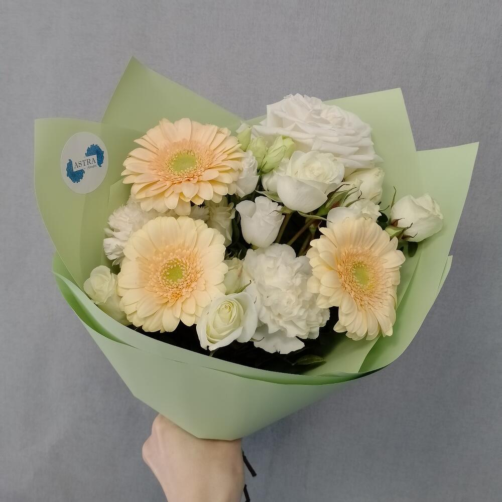 Гербера – 3 шт.роза плая бланка – 1 шт.куст роза – 2 шт.Диантус – 2 шт.Лизиантус – 1 шт.