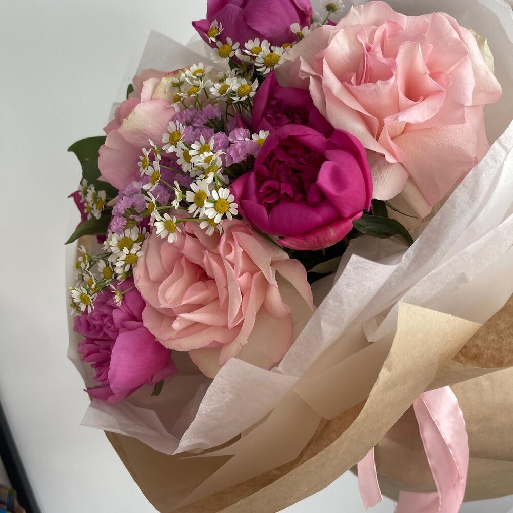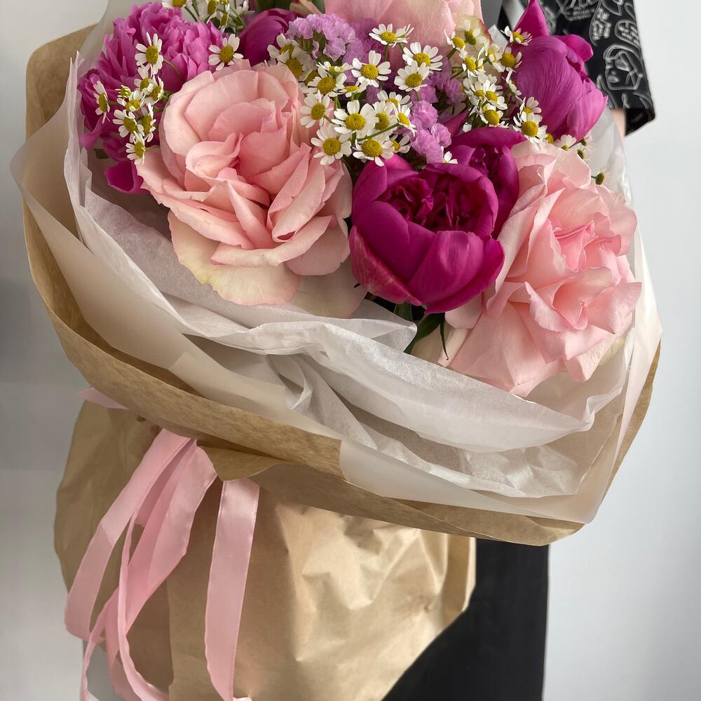 Пион – 6 шт.Статица – 1 шт.Ромашка – 3 шт.Тишью – 2 шт.Крафт – 4 шт.Роза французская – 3 шт.