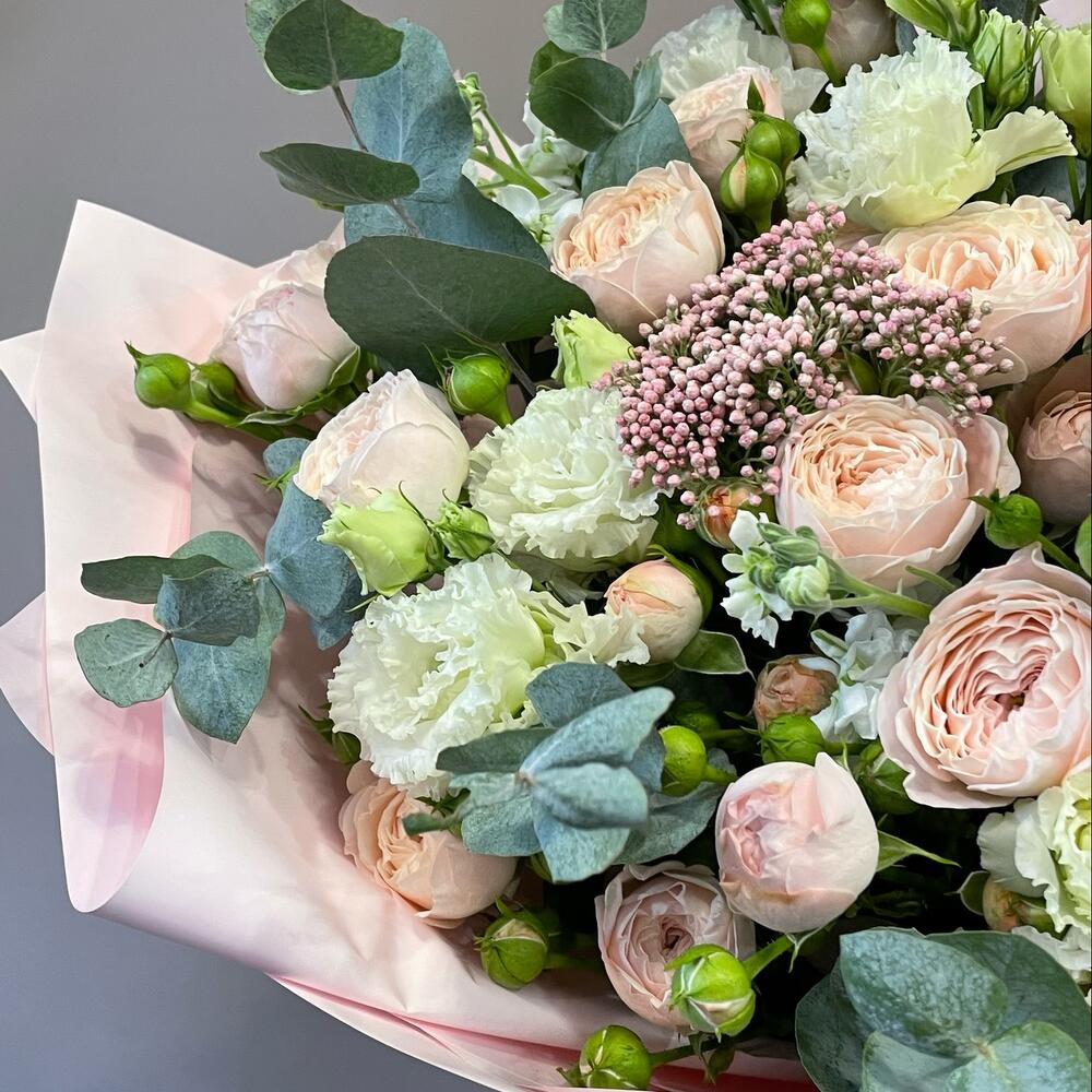 Эвкалипт – 3 шт.джульетта роза пионовидная – 5 шт.Озотамнус – 2 шт.Эустома – 4 шт.Корейская упаковка – 2 шт.бант атласный – 1 шт.