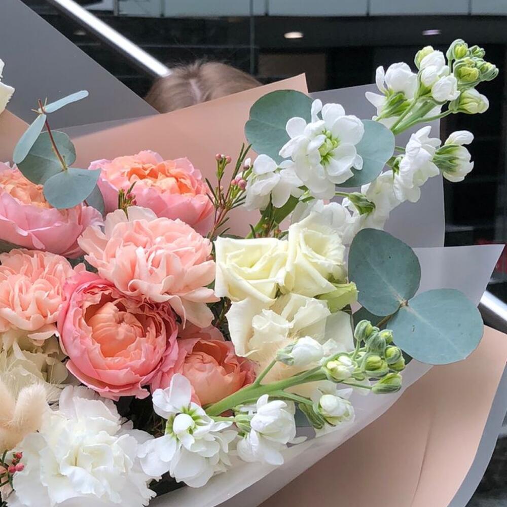 Роза кустовая джульетта – 1 шт.Маттиола белая – 2 шт.Лизиантус Алиса белый – 2 шт.Эвкалипт – 1 шт.Диантус – 3 шт.