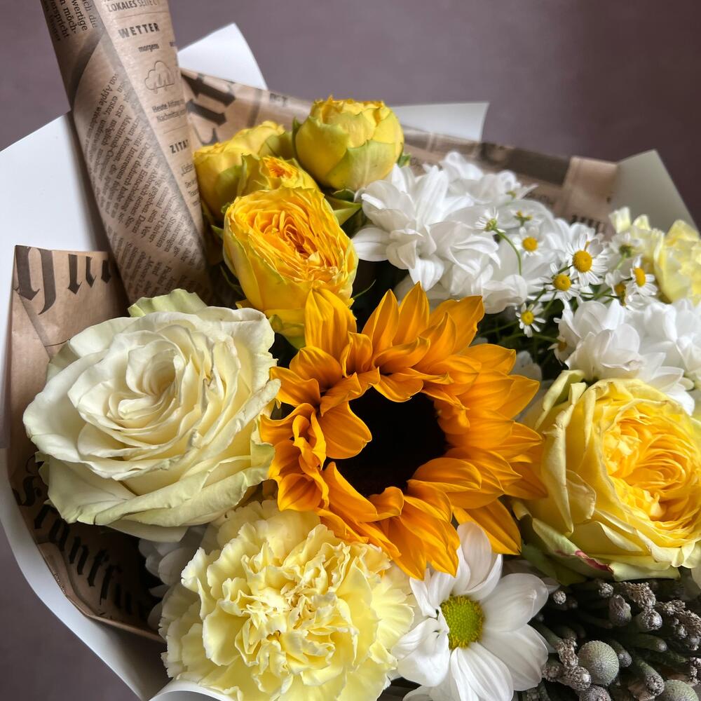 Пионовидная роза – 2 шт.Бруния – 2 шт.Ромашка – 2 шт.Кустовая роза – 1 шт.Гвоздика – 3 шт.Хризантема кустовая – 2 шт.Подсолнух – 1 шт.декоративная упаковка – 1 шт.Атласная лента – 1 шт.