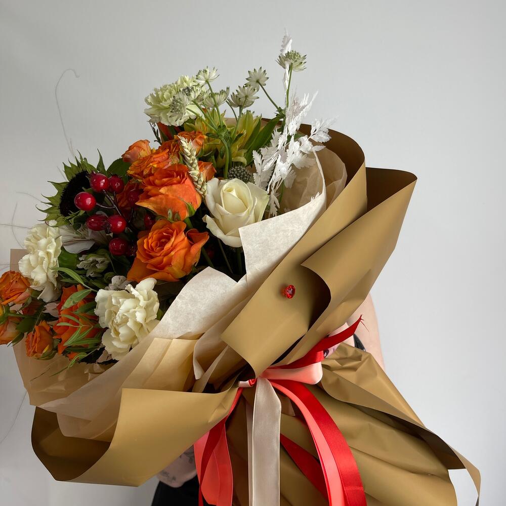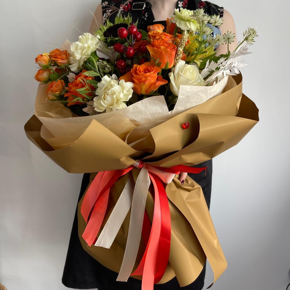 Подсолнух – 1 шт.Диантус – 3 шт.Альстромерия – 2 шт.Кустовая роза – 2 шт.Роза Россия – 5 шт.Астранция – 1 шт.Ягоды декоративные – 1 шт.Папоротник – 1 шт.Фисташка пучок – 1 шт.Пленка матовая – 6 шт.Лента атласная – 2 шт.