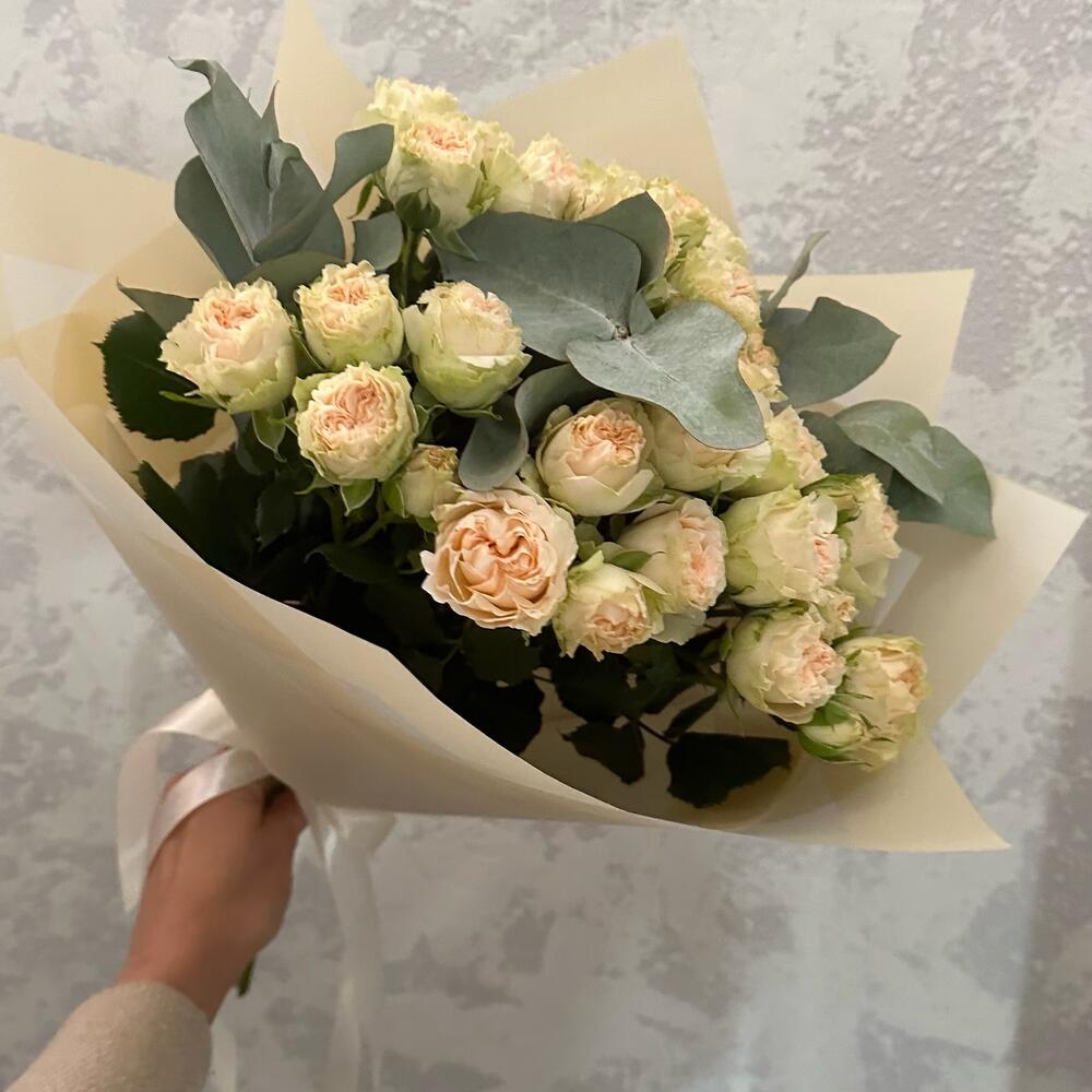 Эвкалипт – 1 шт. Кустовая пионовидная роза – 7 шт. Авторская упаковка – 1 шт.