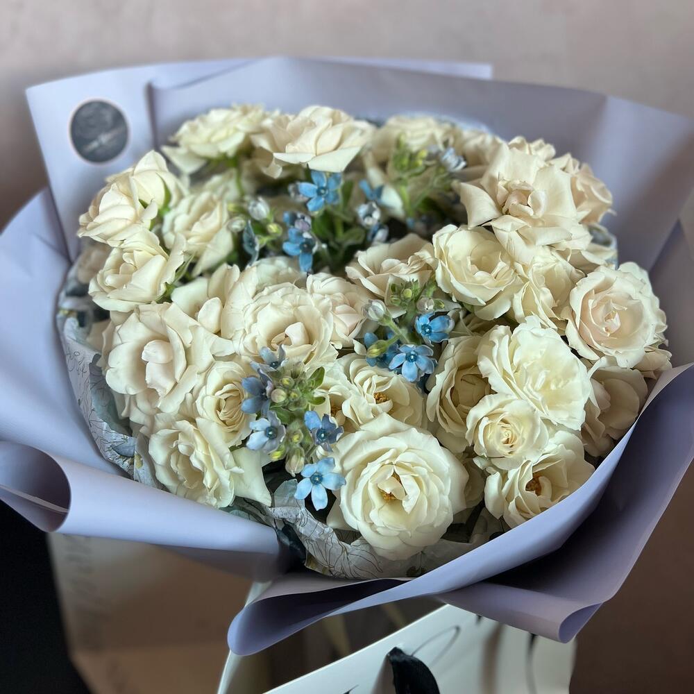 Кустовая белая роза – 13 шт.Оксипеталум – 5 шт.декоративная упаковка – 1 шт.Атласная лента – 1 шт.