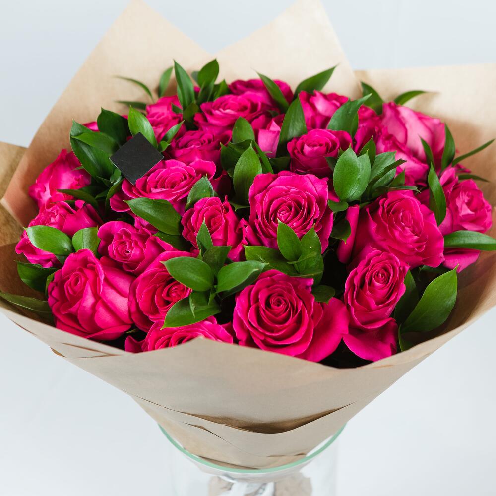 Роза эквадор Pink Floyd – 25 шт.Рускус – 8 шт.Крафт упаковка – 1 шт.Лента атласная – 1 шт.