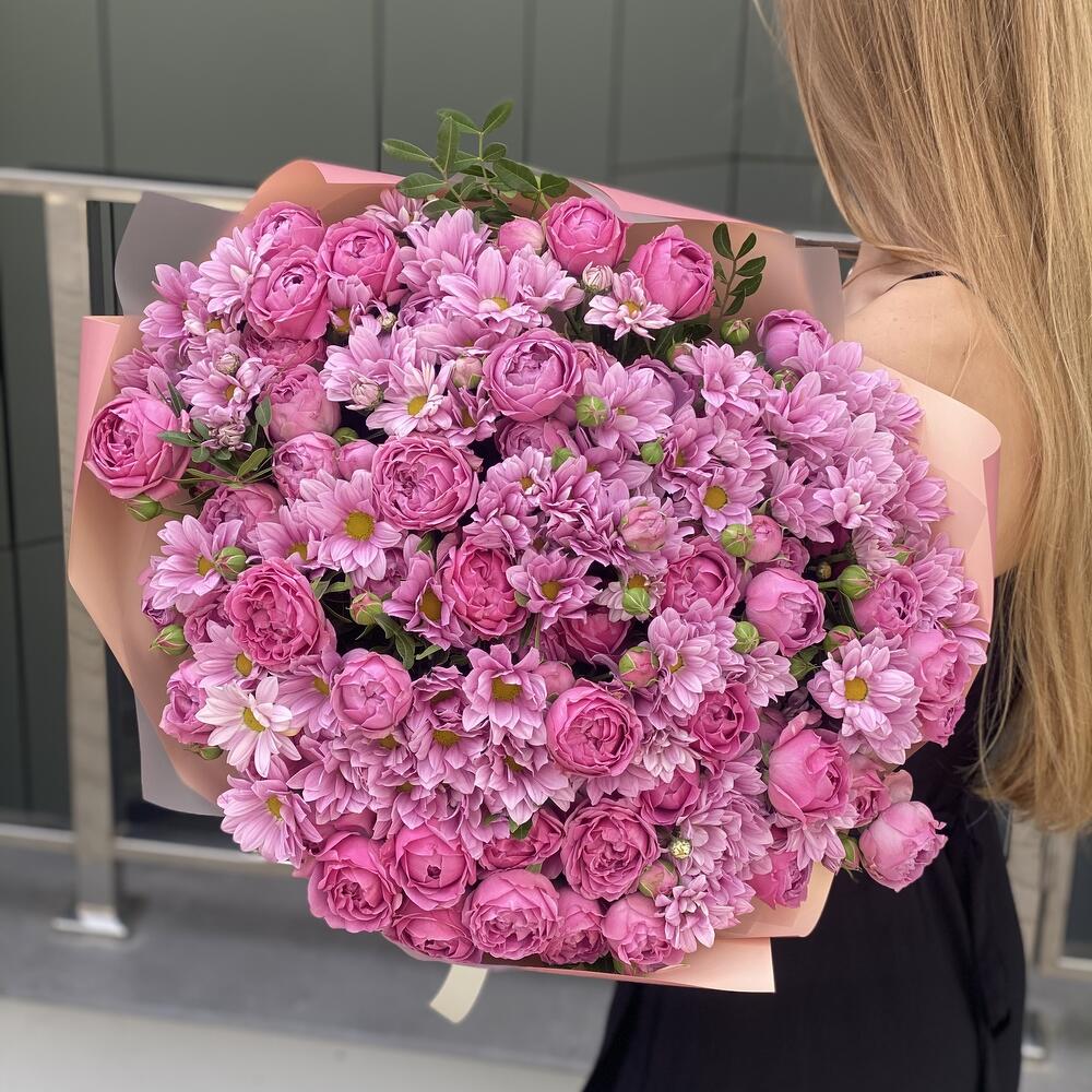 Хризантема гранд пинк – 14 шт. кустовая пионовидная роза misty bubbles – 10 шт. Писташ – 5 шт. Оформление – 1 шт.