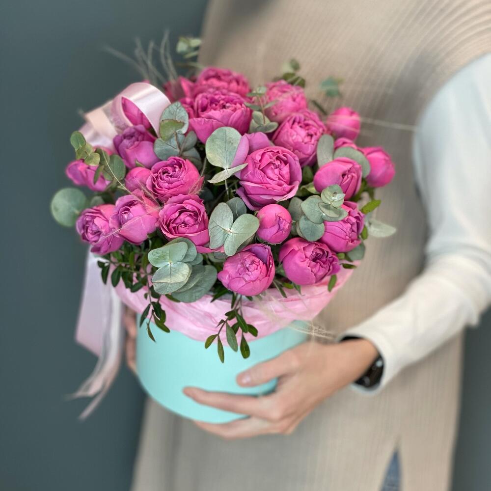 Цветочная композиция в шляпной коробке с розой Misty Bubbles. Охапка нежных пионовидных роз раскрасит этот день яркими красками.* По вашей просьбе, мы подпишем открытку с наилучшими пожеланиями.* Каждый букет цветов (композиция цветов в коробке) упаковывается в прозрачную плёнку и в крафтовый пакет.* Для нежных сортов цветов предусмотрена временная ваза с водой-аквабокс.* К букету прилагается инструкция по уходу и пакетик с подкормкой для продления жизни срезанных цветов в вазе и цветочных композициях на флористической губке.