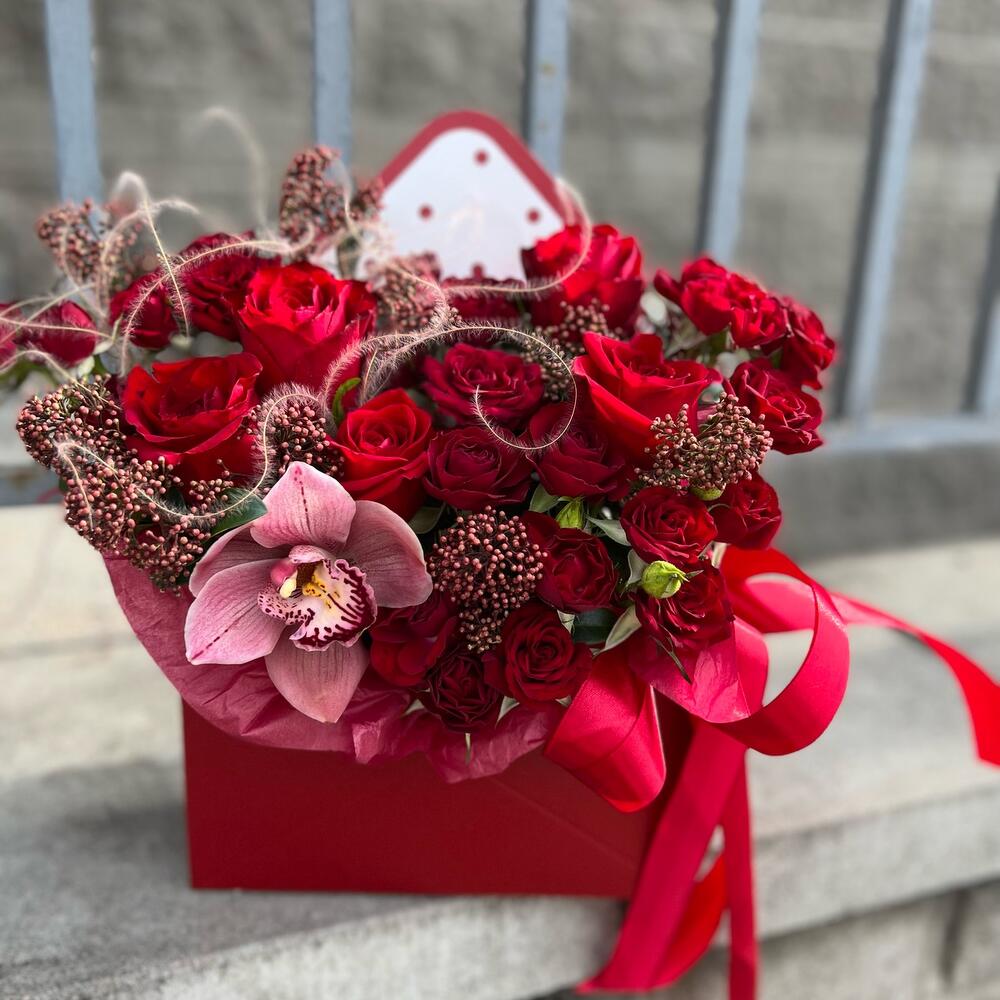 Цветы в конверте с розами,скимией и орхидеей